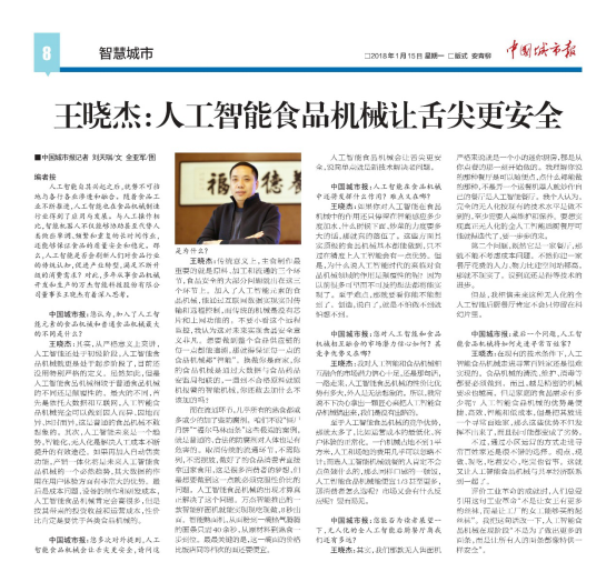 近日,人民日報旗下《中國城市報》記者走進萬杰智能,對話萬杰智能董事長王曉杰,并于1月15日發表文章,更解析萬杰智能如何通過人工智能推動百姓舌尖安心。